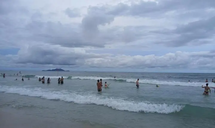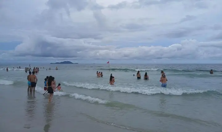 Diversas pessoas, turistas, praianos, frequentadores, moradores, guarda-vidas, trabalhadores da praia dos Ingleses poderão observar uma apresentação dentro do mar, no canto norte da praia dos Ingleses neste final de tarde do 34° dia do ano de 2025.