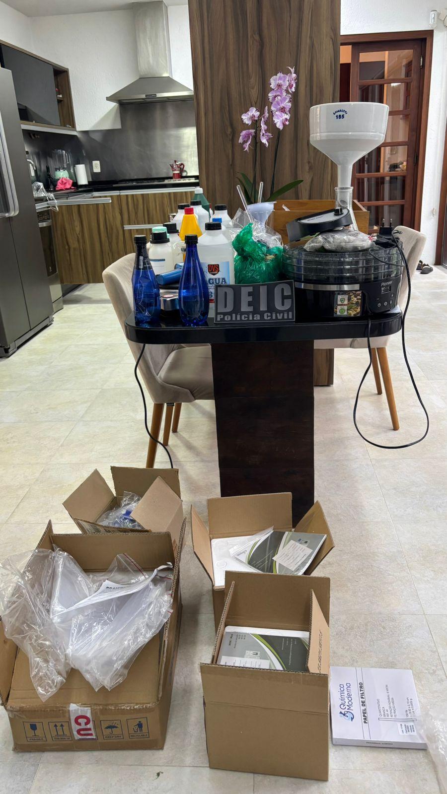 Durante o cumprimento do mandado de busca e apreensão, as equipes especializadas localizaram um laboratório completo para processamento e refinamento de cocaína, equipado com produtos químicos controlados (ácidos sulfúrico e clorídrico), equipamentos laboratoriais sofisticados (centrífuga, proveta, béqueres), matéria-prima (folhas de coca), quantidades expressivas de cocaína já processada e valores em espécie de diversas nacionalidade que chegam a quase R$200.000,00.